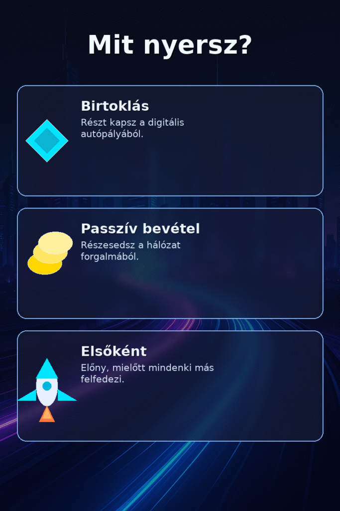 💡 Mit nyersz vele? Lehetőséget, hogy birtokolj egy részt az új “digitális autópályából” Passzív bevételt a hálózat használata után Előnyt, hogy korán beszálltál, mielőtt mindenki más felfedezi